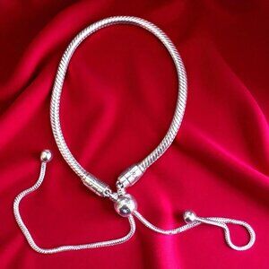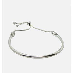 Crafted with precision, the Pandora 925 sterling silver adjustable bracelet elegantly combines a chic rope texture with a sophisticated ball end design. The adjustable feature ensures a comfortable fit for various wrist sizes, while the high-quality sterling silver offers lasting durability. A timeless piece, this bracelet adds a touch of elegance to any ensemble.