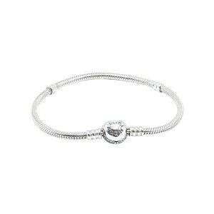 Authentic PANDORA Moments 6.9-Inch Sparkling Heart Pave Clasp Sterling Silver Snake Chain Bracelet 590727CZ - Retired. This classic Pandora Sterling Silver bracelet has a barrel clasp in a heart shape that is adorned by clear Pave Cubic Zirconia stones. A beautiful way to wear your favorite charms.