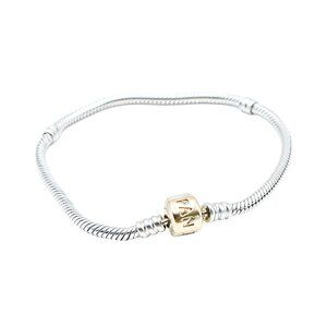Authentic 7.9-Inch PANDORA Moments Snake Chain Bracelet Sterling Silver With 14K Gold 585 ALE Pandora Clasp #590702HG. This best selling bracelet is the perfect foundation for any Pandora charm collection.