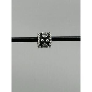 The PANDORA "Oxidized Crown" charm bead features a vintage design with a white/colorless cubic zirconia stone set in sterling silver. Handmade and signed by PANDORA, this retired piece is perfect for adding a touch of beauty to any bracelet or charm collection. The oxidized silver finish adds a unique touch to the overall look, making it a versatile and stackable addition to your jewelry wardrobe. Made in Thailand, this charm bead is crafted with precision and attention to detail, making it a standout piece for any charm bracelet. It is stamped 925 and ALE. It is a retired bead.