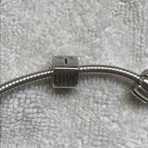 This PANDORA fashion jewelry "I Love You" charm is crafted in sterling silver and 14K yellow gold. There are some slight signs of wear on the charm - but it's got lots of character and life left! This was bought at Jared's. Style # 790200.