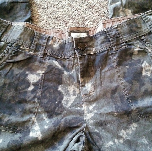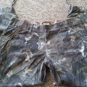 Very cute camo pants never wore :) there are tie ups at the bottom in case ud like to scrunch them also buttons to make Capri's wear boot cut or straight leg just by tieing the bottoms very versatile :)