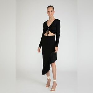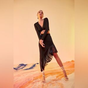 The shape with a diagonal slit is super cool and the fringes bring a beautiful movement to the skirt. Wear with a black top and complete the look. The mesh of the skirt is a mix of rayon and elastane that brings comfort and shapes the body.