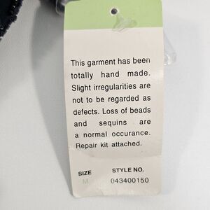 This stunning navy blue blouse features intricate hand-sewn floral patterns made from shimmering dark blue sequins and glass beads. Crafted from 100% silk with a polyester lining, it offers a luxurious feel and comfortable fit. The short sleeve design is complemented by a scalloped hem and V- neckline, giving the piece a sophisticated, vintage-inspired charm. Slight shoulder padding provides gentle structure, while the inside is smooth and soft against the skin. This garment is in new with tags, with minor loose threads noted (see photos), and silk lossening in few spots.