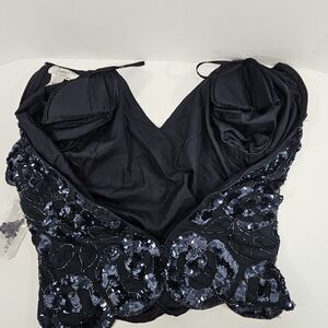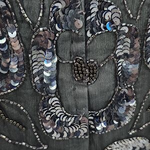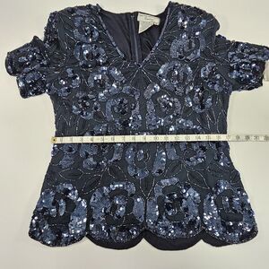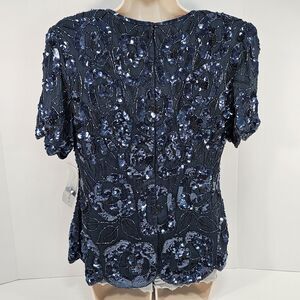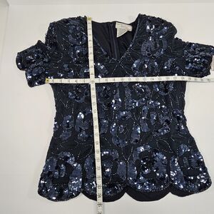 PAPELL Boutique Evening Navy Sequin Beaded Silk Scalloped Hem Blouse Top Size M