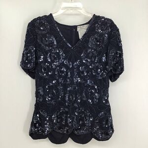 PAPELL Evening 100% Silk Sequin & Beaded Scalloped Hem Cocktail Party Top Size M
