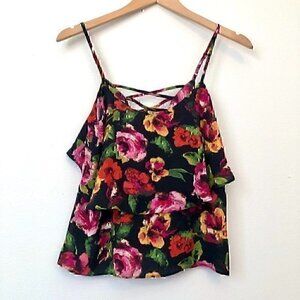 PAPER CRANE Black Pink Red Green Floral Flounce Tiered Boho Crop Top Tank Blouse