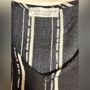 This elegant blouse by Paper Crane, size S, features a striking black and white striped pattern with a flattering peplum waist. The long sleeves and deep V-neck add a touch of sophistication, making it a versatile addition to any wardrobe.