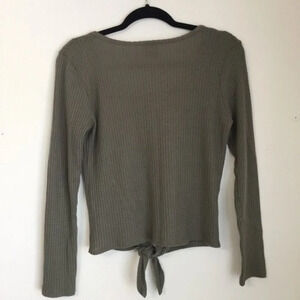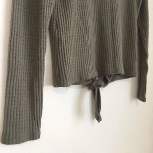 Paper Crane Thermal Henley Knot Top. 3 wooden buttons on chest and tie front in a pretty olive green color in a super soft material. Excellent pre-loved condition.