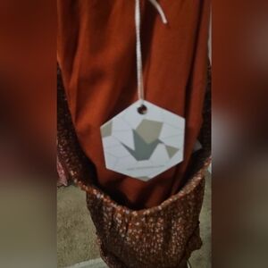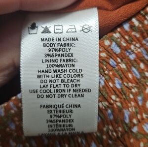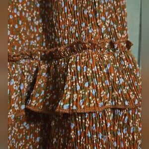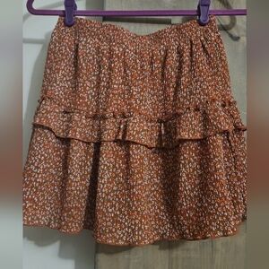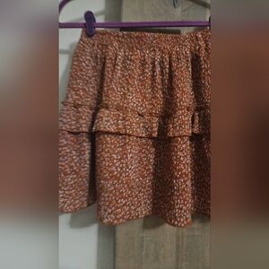Such a cute skirt. Material has slight texture to it. Msocked waist band. Layer ruffle. Rust color with tiny blue delicate flowers. Fully lined. Slip on style.
