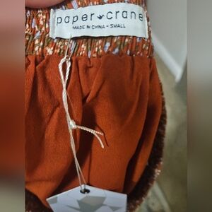 PAPER CRANE Smocked ruffle layer mini skirt. Rust/blue. Size small NWT