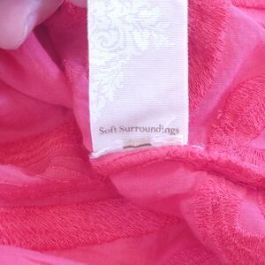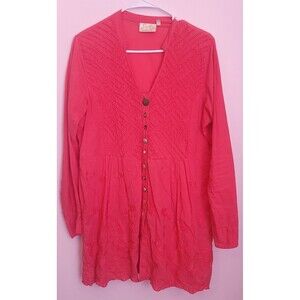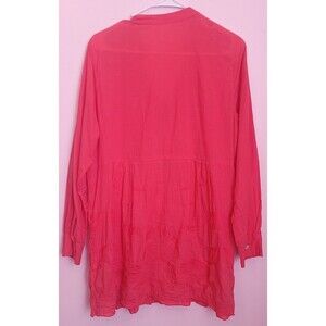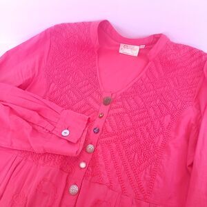 This Paper Lace brand Blouse Button Up by Soft Surroundings Ruffles Top is a charming and versatile piece perfect for various occasions such as travel, parties, casual outings, or business events. The chiffon fabric and ruffly accents give it a touch of elegance, while the embroidered detailing adds a unique bohemian flair. With a collared neckline, long sleeves, and an elastic waist, this lightweight and sheer top offers ease of care and a comfortable fit. Ideal for all seasons, this salmon-colored blouse fits those looking for a classic yet with a 90s-inspired touch to their wardrobe. Each button is unique which gives it a boho vibe to it.