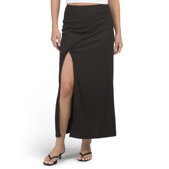 fabric provides stretch, ribbed design, front cinch detail, asymmetrical front slit