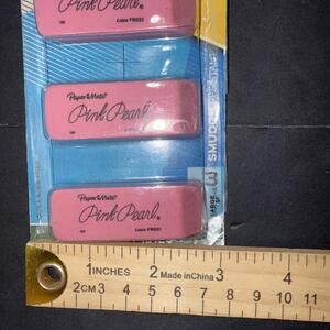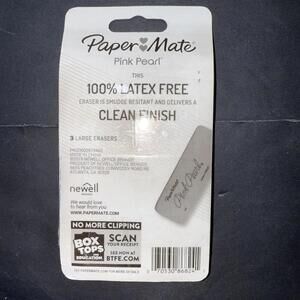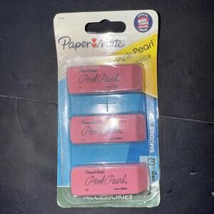 PAPERMATE Pink PEARL ERASERS 3 Pack Eraser LATEX FREE Pencil Mark Removers NEW, but the package came apart and the erasers fell out into a stationary drawer, taped package back together.