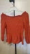 This is a rust-colored, off-the-shoulder, 3/4-sleeved women's blouse. It has a smocked bodice and a peplum hem. It is a size S