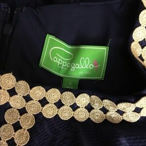 Pappagallo Size 6 The Mandy stamped floral dress semi fitted navy with gold medallion trim rear zipper no stains or tears approximate pit to pit 17 shoulder to hem 36 refer to photos for more details