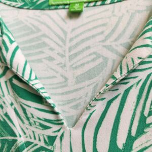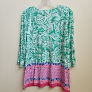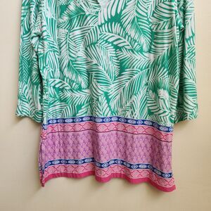 PAPPAGALLO Top Womens Medium Green Pink Palm Frond V Neck 3/4 Sleeves Tunic