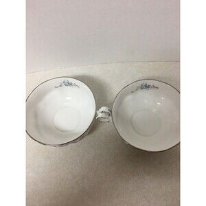 This is a set of two vintage Paragon fine bone china soup bowls from England in the Romance pattern. The soup bowls have a round shape with a glossy finish and feature a double handle design. They are in white color, with a diameter of 4 1/2" and a height of 2 1/4". The bowls are part of the Mid-Century Modern style and are suitable for all occasions.