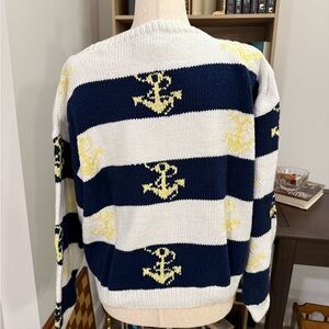 Embrace a nautical vibe with this stylish striped sweater. Featuring navy and white stripes with anchor motifs, it's perfect for a casual day out. Stay cozy and chic.