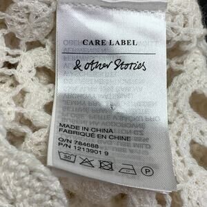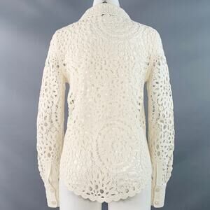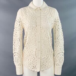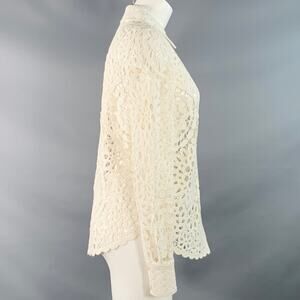 PARIS ATELIER shirt in a cream cotton blend crochet featuring a floral and stars crochet design, spread collar, and button closure. Excellent Pre-Owned Condition.Marked: size not markedMeasurements:Shoulder: 15 in.Bust: 38 in.Sleeve: 25.5 in.Length: 25.5 in.