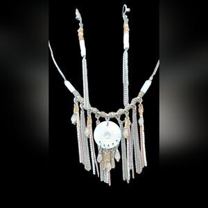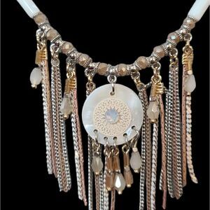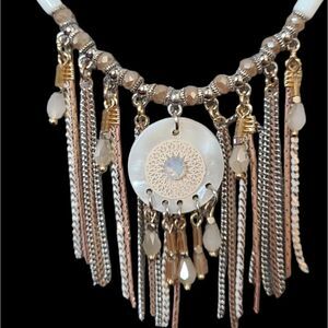 Beautiful Mother-Of-Pearl centerpiece is  surrounded by crystalline beads and rose gold, gold and silver chains, making a striking statement in this necklace set with matching danglers. Perfect anywhere -- spring summer winter fall, it will take you anywhere from business casual to formal, be it a party, resortwear, travel on vacation! Beautifully versatile, elegant set of jewelry!