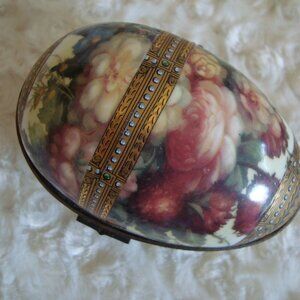 A nice vintage egg trinket box. When you open the box there is a rose inside the top and the bottom. No chips or cracks.