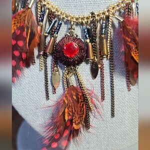 Beautiful vivid colors in feathers, stones and beads make a striking atatement in this necklace set with matching earrings. Perfect anywhere -- spring summer winter fall, it will take you anywhere from business casual to formal, be it a party, resortwear, travel on vacation! Beautifully versatile, colorful piece of jewelry!
