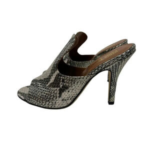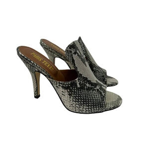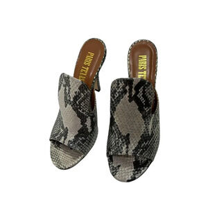Ecru and black leather snake-effect mules from paris texas featuring a snakeskin effect, an open toe, a branded insole, a slip-on style and a high stiletto heel.