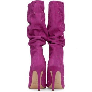 Mid-calf suede boots in pink. Gathering and crystal-cut detailing throughout.