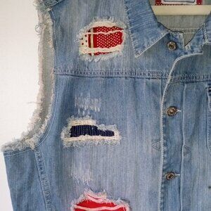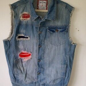 DIstressed denim cut-off vest from PARISH NATION in size 3XL. One chest pocket, collar, metal buttons, cotton patches. Measures 24" armpit to armpit laid flat and 29" neckline to hem in back. Excellent condition. This jacket is distressed, so hard to pinpoint what is wear and what is destressing. No damage, no unintended flaws, clean and no odors.