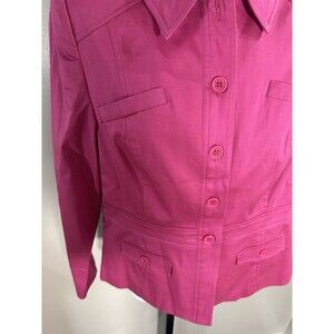 Dress up or dress down with this chic PARISIAN SIGNATURE hot pink button-down shirt, perfect for any casual occasion. Made from a comfortable cotton/spandex blend and styled with a flattering V-neck and long roll-tab sleeves, this top is a versatile addition to your wardrobe. Its solid pattern and basic style make it easy to pair with your favorite jeans or skirts, while the linen fabric provides a breathable feel.