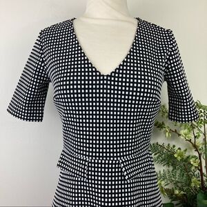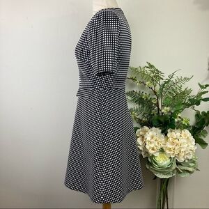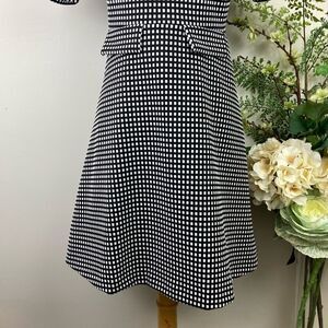 A classic dress. Fitted bodice. Flair skirt. Black white pattern. Faux front pockets. Wear at work, brunch or dates. Back zipper
