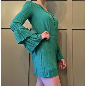 PARKER 100% Silk Emerald Green Ruffle Bell Sleeve Button Front Dress Size XS