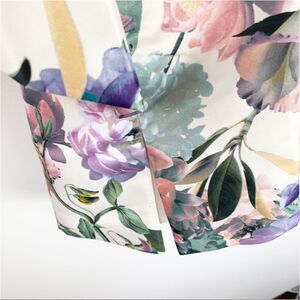 The botanical floral print on this satin mini strapless dress is stunning in its detail. A superior quality garment, this dress is fully lined, has boning and corset straps for support and an elegant waterfall ruffle that flows from the empire waist to the side of the dress. It is very hard to see in the pictures with the print. Side slit and cross-over bodice. I wish I could find a stock picture so you can appreciate the beauty of this dress. One tiny stain on the hem of the lining.