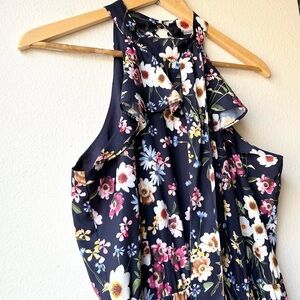 A high neck sleeveless dress features a vibrant floral pattern, a pretty neck tie with ruffle trim, and an eye-catching asymmetrical hem for flowy movement