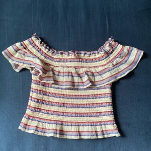 PARKER Lizette Smocked Crop Off the Shoulder Top Cabana Stripe Red Blue Sz Small