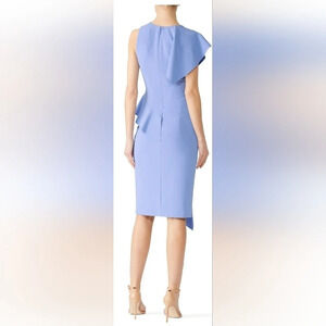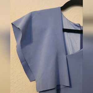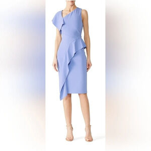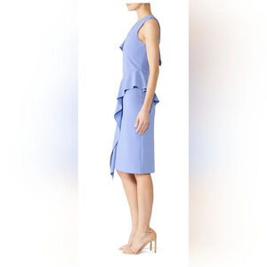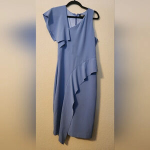 Flouncy wraparound ruffles grace the asymmetric neckline and pencil skirt of this polished Parker dress. Blue crepe (100% Polyester). Hourglass. Sleeveless. Asymmetric v-neckline. Hidden back zipper with hook-and-eye closure. Fully lined. 43" from shoulder to shortest hemline, 46" from shoulder to longest hemline. No flaws!