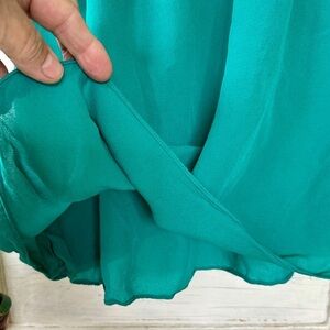 PARKER, WOMENS MINI DRESS. DOLMAN SLEEVE WITH RUCHING. V-NECK WITH SNAP, ELASTIC WAIST, LINED. 100% SILK. SIZE XS