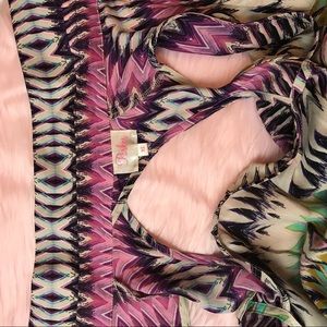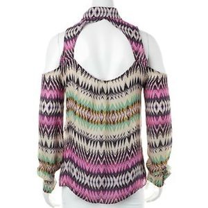 Multi-color shockwave graphic print lightweight silk button-down / buttonup blouse with peekaboo open back design. Like new / nwot. Size XS. Photos are of exact shirt for sale. So pattern is beautiful and aligns perfectly as shown. 100% silk.