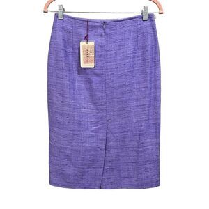 This is a gorgeous purple 100% silk knit tweed fully lined classic straight pencil skirt with back slit and concealed zip. The fabric is spun with wild silk giving it a unique textured feel while remaining soft and comfortable. Lining is acetate and viscose blend.