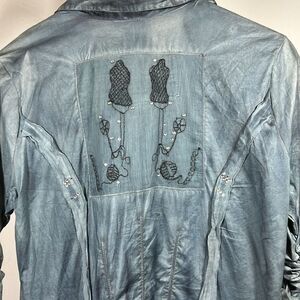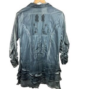 Button front closure. Spread collar. 3/4 sleeves with ruched detail and sheer ruffle cuff. Tiered ruffle hem. Floral lace embroidery. Rhinestone stud embellishments. Blue chambray with black lace and white buttons. 100% cotton. Adorable. No stretch. Boutique wear. Artsy. Whimsy. Resort. Casual. Boho. Bohemian.