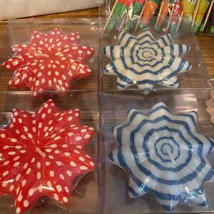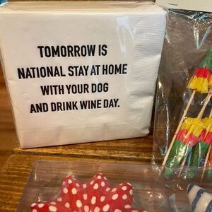Fun items! Crate & Barrel floating candles. Funny Day Off with Dog napkins. Two packs Pier One umbrella drink sticks. Older! Worry less drink more wine coffee cup. New. Just an arrangement of items I won’t use! Clean home!