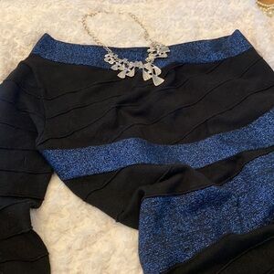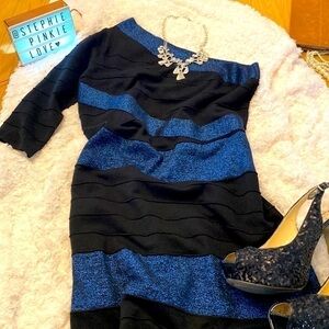 Time to go out and live a little. This flirty dress 👗 will certainly draw attention 👋. Black with Blue Metallic strips. Size 2X fits true to size and hugs your curves.