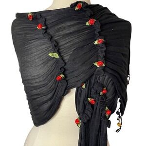 PASHMINA Black Embellished with Floral Appliqués & Beaded Fringe