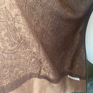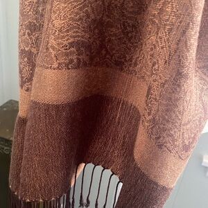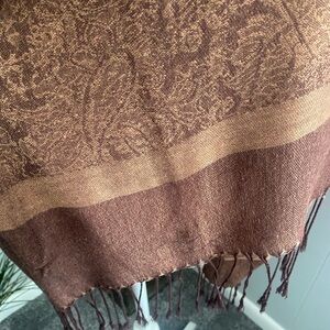 Pashmina scarf/shawl. Beautiful brown colors, 28 1/2” wide, 74” long, fringe 3”. Just had dry cleaned.