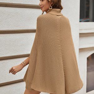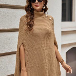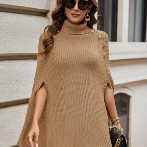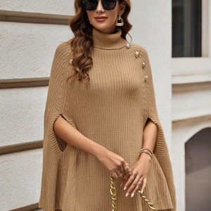 PASSION Turtleneck Button Detail Cloak Sleeve Knit Poncho