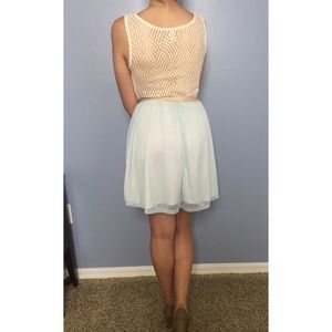 Short Pastel Dress. Charlotte Russe. Baby blue and beige. Lace back. Ribbon belt.
