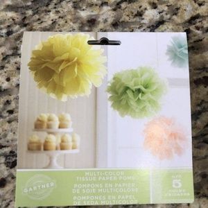 Package includes five tissue poms: one blue, one pink, one yellow, two green.