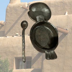 Art suitable for cooking. Display it or cook with it or do both. The artist's signature and date are on the bottom of the pot. Exquisite hand-coiled lidded pot and matching serving spoon by Santa Fe artist Pat Lollar. Crafted by hand in 1999. Displayed but not used in the home of collectors of Santa Fe artwork. It shimmers with colors of charcoal, gold, and rust. The detail on the spoon handle, the pot handles, and the lid are gorgeous. For the Southwest art collector or the chef. The spoon is 12" long and approximately the length of the pot. May be used on gas, electric or camp stoves or in the microwave. Not for storing liquids. Do not use abrasive cleaners or scouring pads. Hand wash only. It's said that clay pots enhance the flavors of foods. Try it!