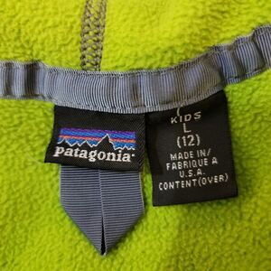 Pre-owned Patagonia lime green quarter zip hooded fleece pullover size kids large. Hooded long sleeve fleece jacket with kangaroo pocket. Please note- the one sleeve has some markings. Please see photos.